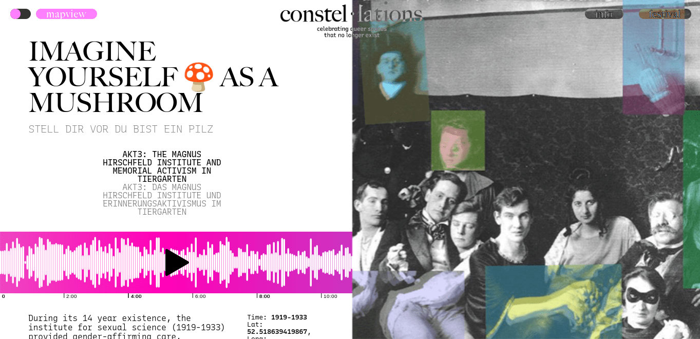 During its 14 year existence, the institute for sexual science (1919-1933) provided gender-affirming care, counseling, surgeries, and community support. Led by Magnus Hirschfeld, queer, trans*, jewish people who found shelter here have danced, talked, feasted, and celebrated Shabbat in each other’s loving arms. Hani Portner’s audio portrait engages us in a conversation with the land about reclamation, revitalization and retaliation while recounting the people’s stories. Imagine yourself as a mushroom – by envisioning ourselves as mycelium, connecting, entangling, and supporting, we can together build something beautiful, in solidarity with the marginalized and honor our trancestors.