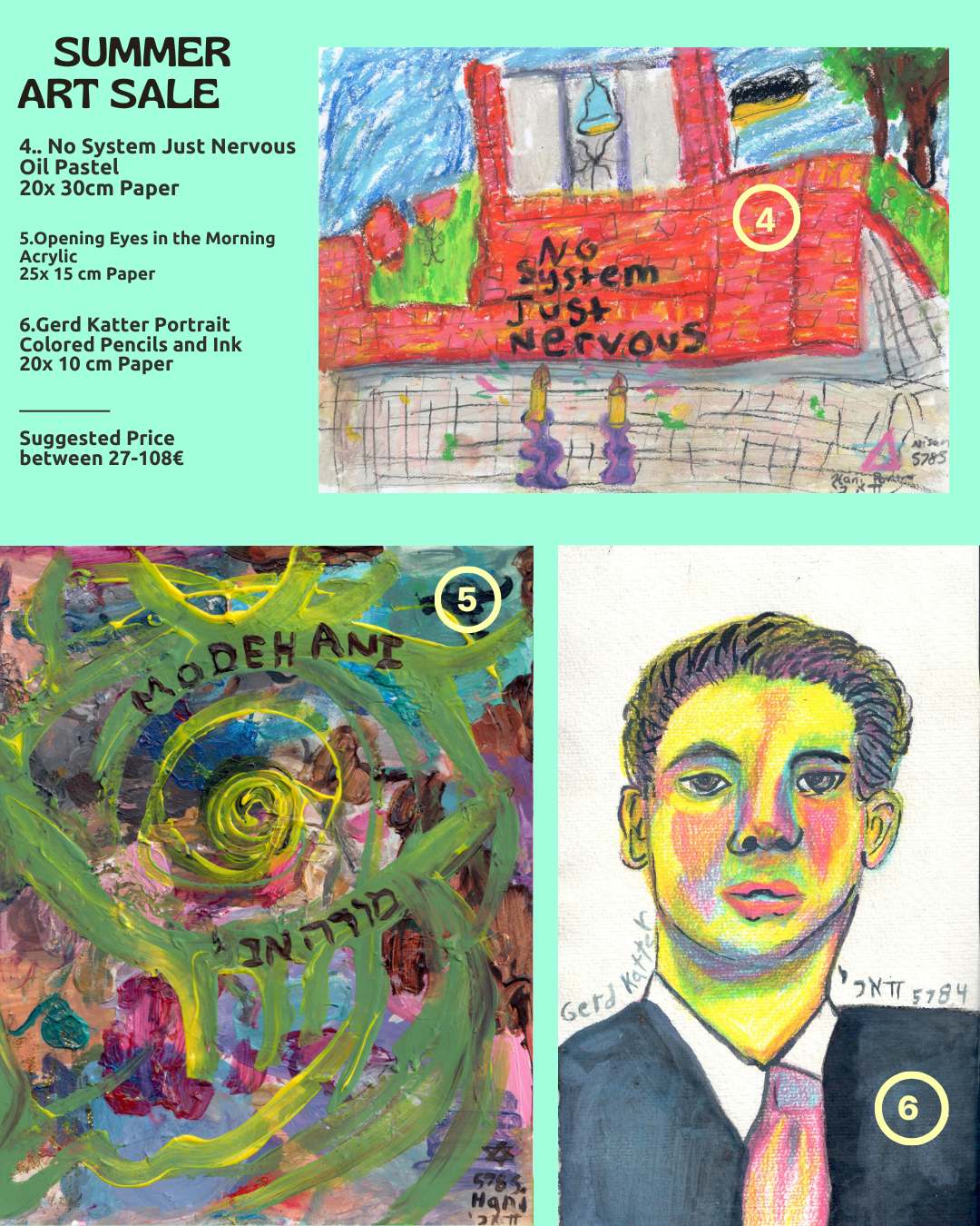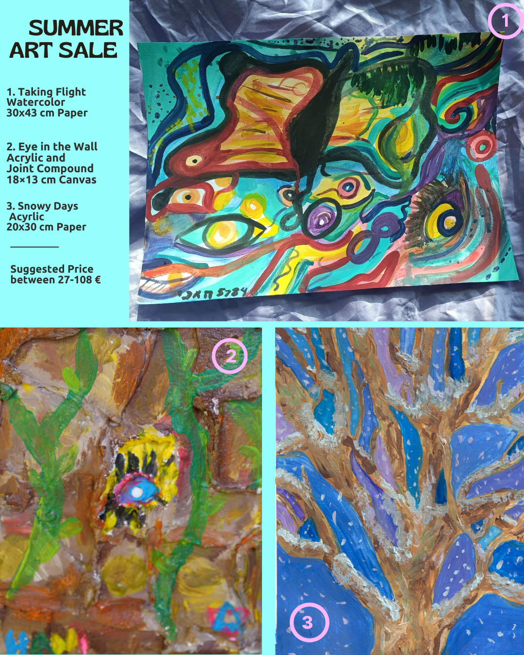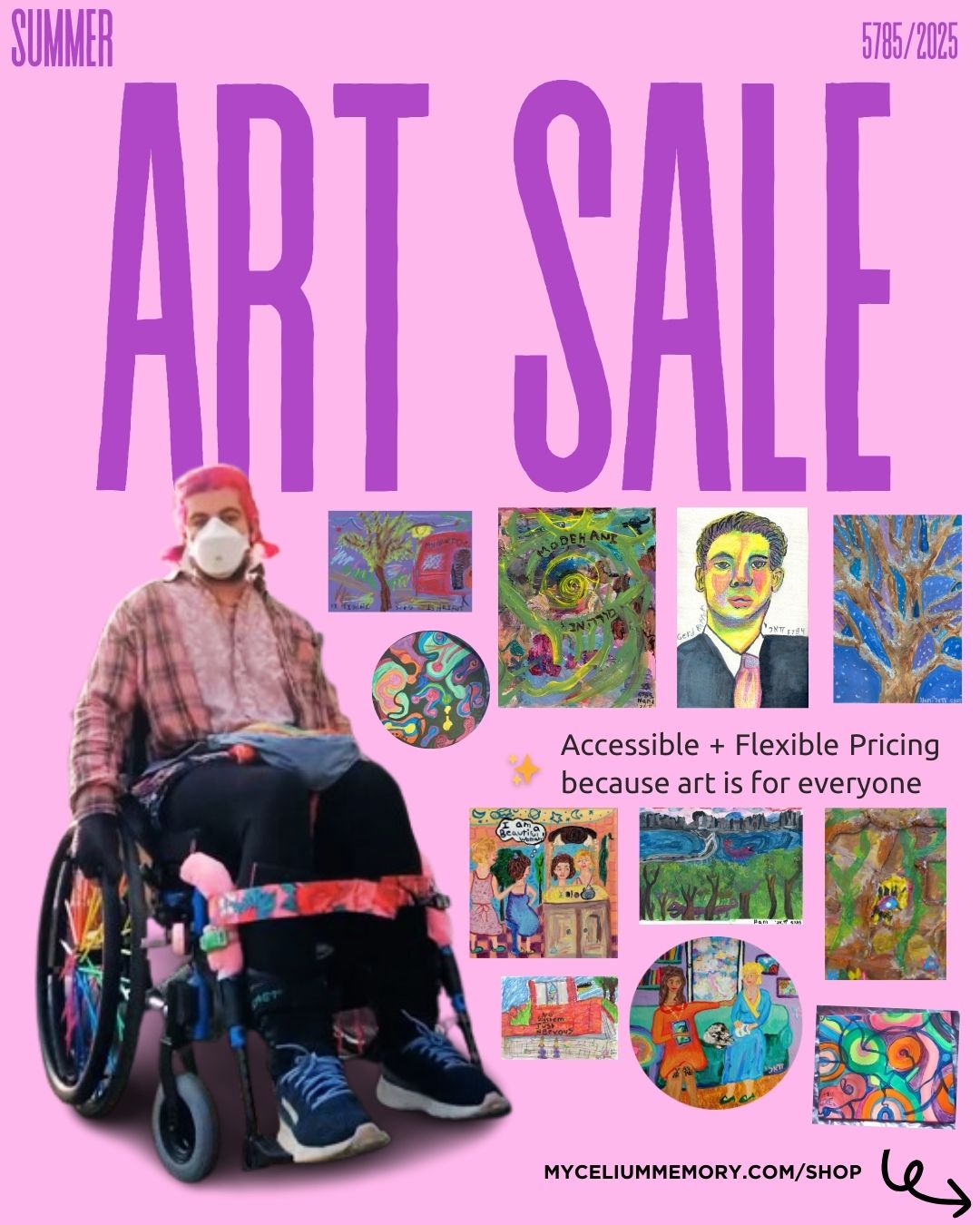 So many colorful artworks and many I have never shown before are included in this sale! I have some dreams for the future and some new artworks I want to make but art supplies are so expensive and I still have accessories I need for my new wheelchair….help me buy what I need to make my life easier and more colorful while taking home one of my orginal paintings !