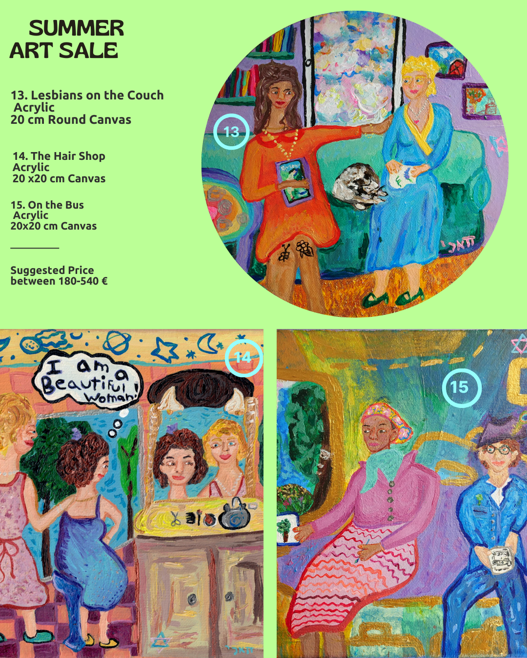 I like to have flexible pricing on my artworks so that they can hopefully be more acessible for people who would otherwise not be able to afford fine art. If you want to make an offer above my suggested pricing, that is very welcome ! If you really like a painting but cant afford the lower suggested price, that is fine, please still reach out and see if we can make something work. A lot of my paintings are also available as prints, stickers etc on my redbubble shop.