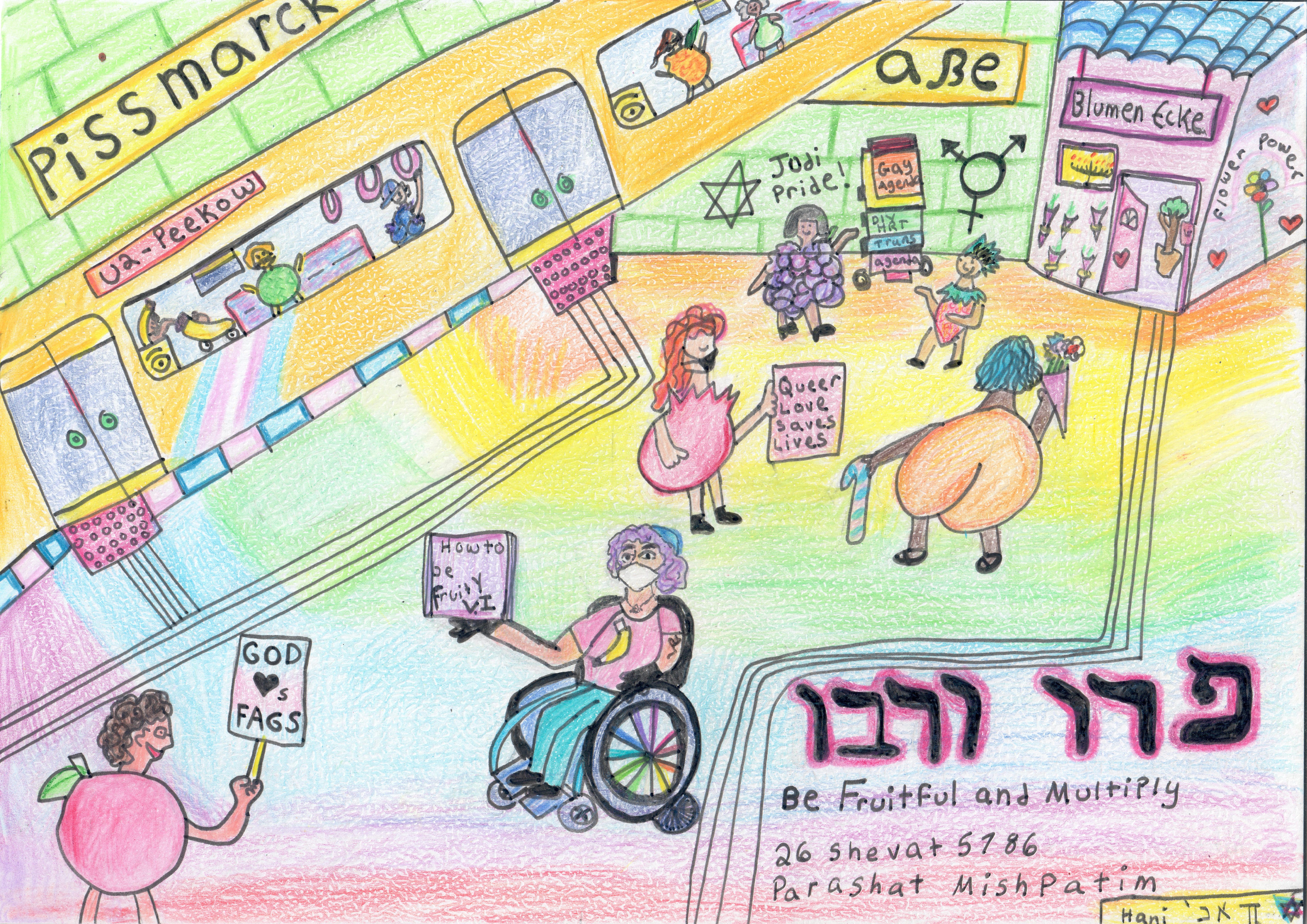 I had the idea of interpreting the mitzvah to be fruitful and multiply to go beyond raising or creating children. What if it could mean creating a welcoming world where people can feel empowered to come out of the closet and live as their true selves. What if being fruitful was being so fruity that more fruits grow in the fertile ground of representation and resources? What if there were ways that trans kids could become trans adults without trauma? To find love and grow into one’s gender and sexuality without shame and guilt shrouding self expression? To feel protected and safe wearing whatever clothing and hairstyles that feel aligned with one’s personal style and gender expression when walking (or rolling) on our shared streets?